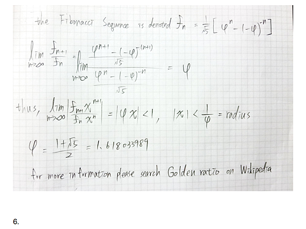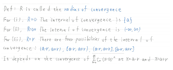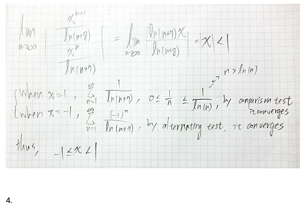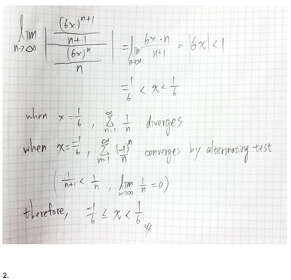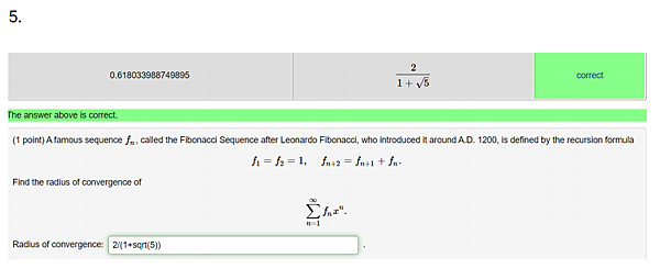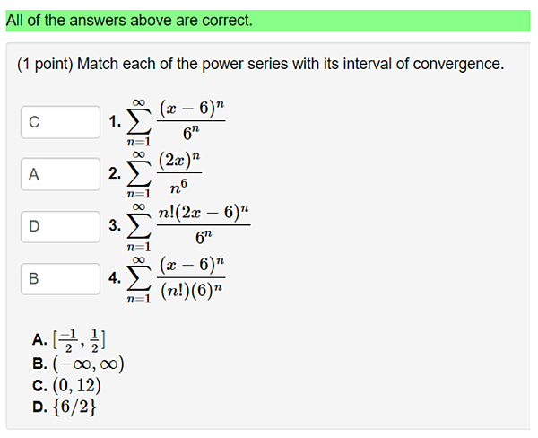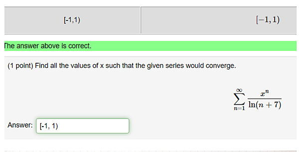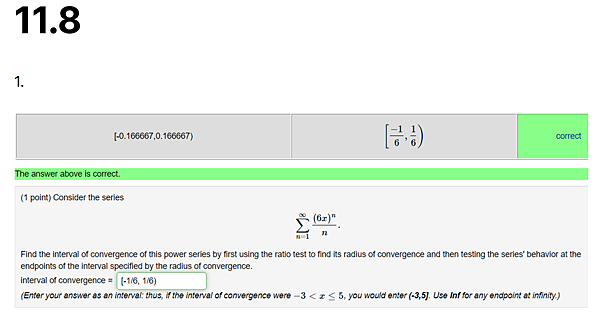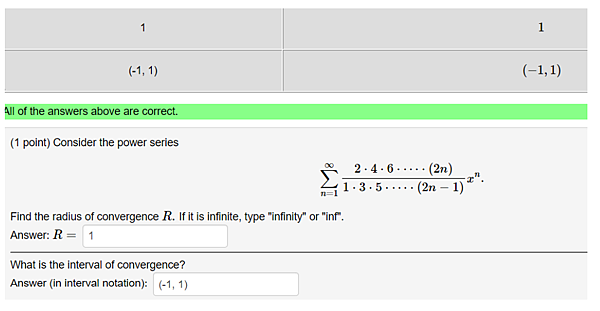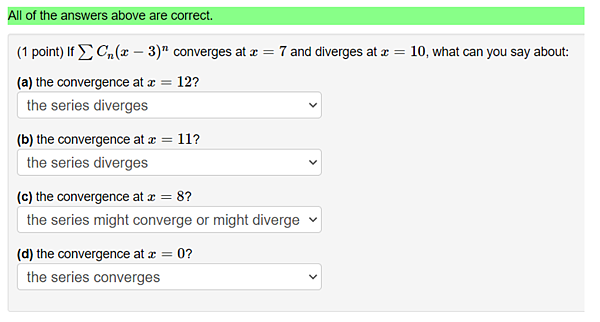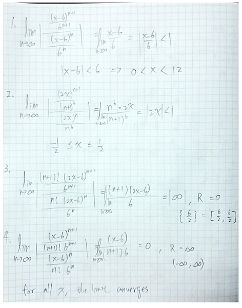 Consider the series ∑n=1∞(6x)nn. Find the interval of convergence of this power series by first using the ratio test to find its radius of convergence and then testing the series' behavior at the endpoints of the interval specified by the radius of convergence. interval of convergence = If ∑Cn(x−3)n converges at x=7 and diverges at x=10, what can you say about: Find all the values of x such that the given series would converge. ∑n=1∞xnln(n+7) Match each of the power series with its interval of convergence. C 1. ∑n=1∞(x−6)n6n A 2. ∑n=1∞(2x)nn6 D 3. ∑n=1∞n!(2x−6)n6n B 4. ∑n=1∞(x−6)n(n!)(6)n A famous sequence fn, called the Fibonacci Sequence after Leonardo Fibonacci, who introduced it around A.D. 1200, is defined by the recursion formula f1=f2=1,fn+2=fn+1+fn. Find the radius of convergence of ∑n=1∞fnxn. Consider the power series ∑n=1∞2⋅4⋅6⋅⋯⋅(2n)1⋅3⋅5⋅⋯⋅(2n−1)xn. Find the radius of convergence R. If it is infinite, type "infinity" or "inf". Answer: R=