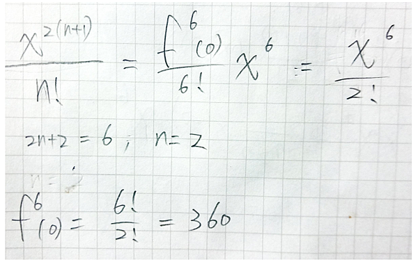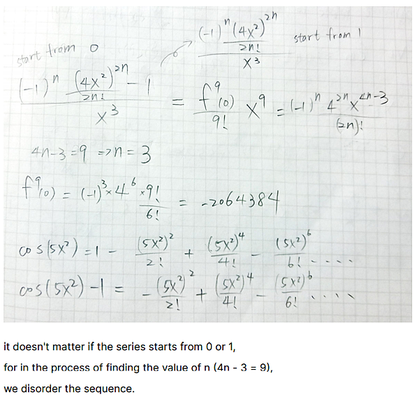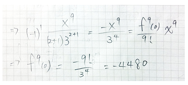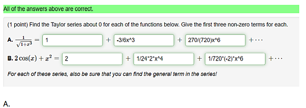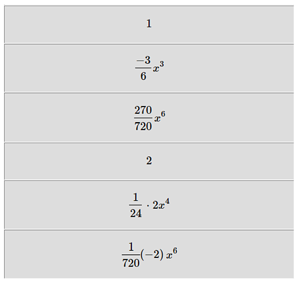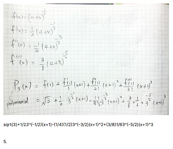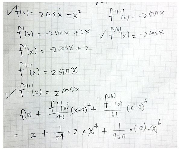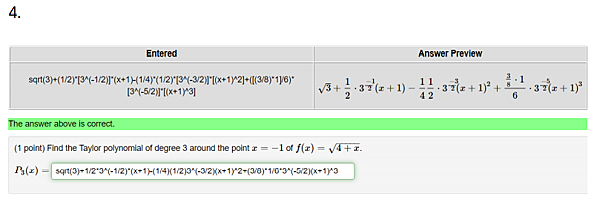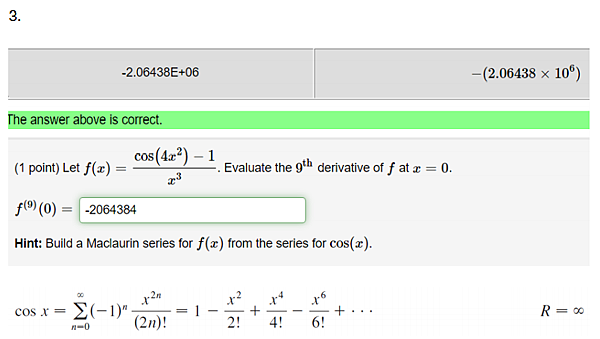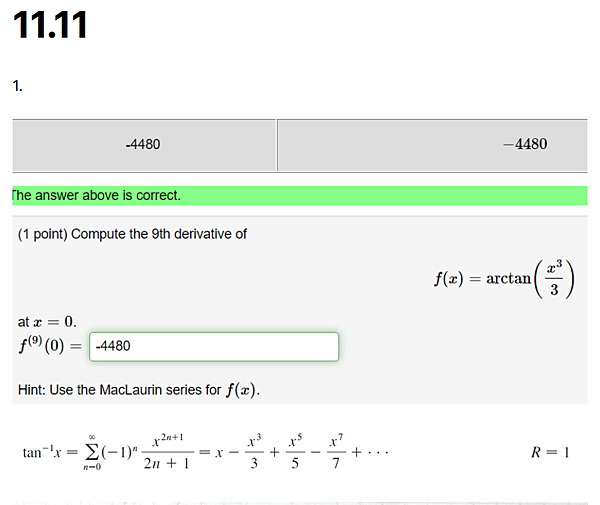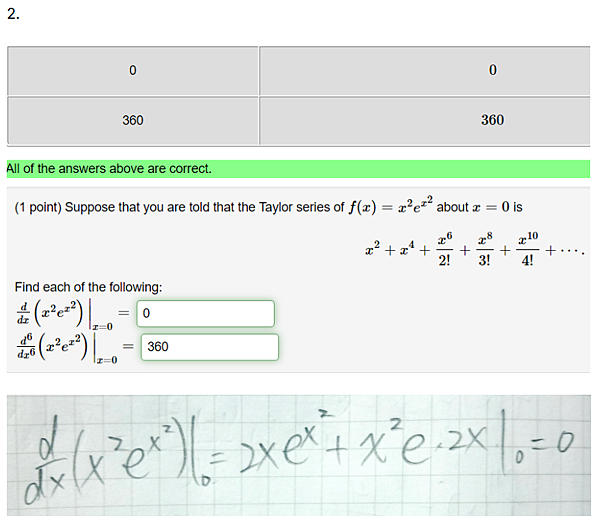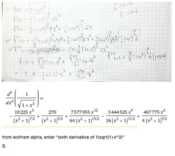 Compute the 9th derivative of f(x)=arctan(x33) at x=0. f(9)(0)= -4480 Hint: Use the MacLaurin series for f(x). Suppose that you are told that the Taylor series of f(x)=x2ex2 about x=0 is x2+x4+x62!+x83!+x104!+⋯. Find each of the following: ddx(x2ex2)∣∣∣x=0= d6dx6(x2ex2)∣∣∣x=0= Let f(x)=cos(4x2)−1x3. Evaluate the 9th derivative of f at x=0. f(9)(0)= -2064384 Hint: Build a Maclaurin series for f(x) from the series for cos(x). Find the Taylor polynomial of degree 3 around the point x=−1 of f(x)=4+x−−−−−√. P3(x)= Find the Taylor series about 0 for each of the functions below. Give the first three non-zero terms for each. A. 11+x3√= 1 + -3/6x^3 + 270/(720)x^6 +⋯ B. 2cos(x)+x2= 2 + 1/24*2*x^4 + 1/720*(-2)*x^6 +⋯ For each of these series, also be sure that you can find the general term in the series!