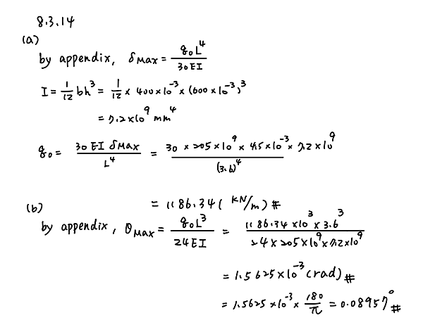 (a) Find peak intensity q0 if the deflection at joint B is known to be 4.5 mm. Assume that modulus E = 205 GPa.