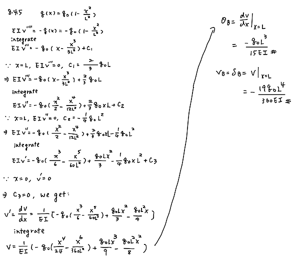 A cantilever beam AB is subjected to a parabolically varying load of intensity q = q_0(L^2 - x^2)/L^2, where q_0 is the maximum intensity of the load (see figure). Derive the equation of the deflection curve, and then determine the deflection delta_B and angle of rotation theta_B at the free end. Use the fourth-order differential equation of the deflection curve (the load equation).