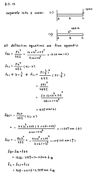 The cantilever beam ACB shown in the figure has flexural rigidity EI = 2.1 Times 106 k - in.2 Calculate the downward deflections delta C and delta B at points C and B, respectively, due to the simultaneous action of the moment of 35 k - in. applied at point C and the concentrated load of 2.5 k applied at the free end B.